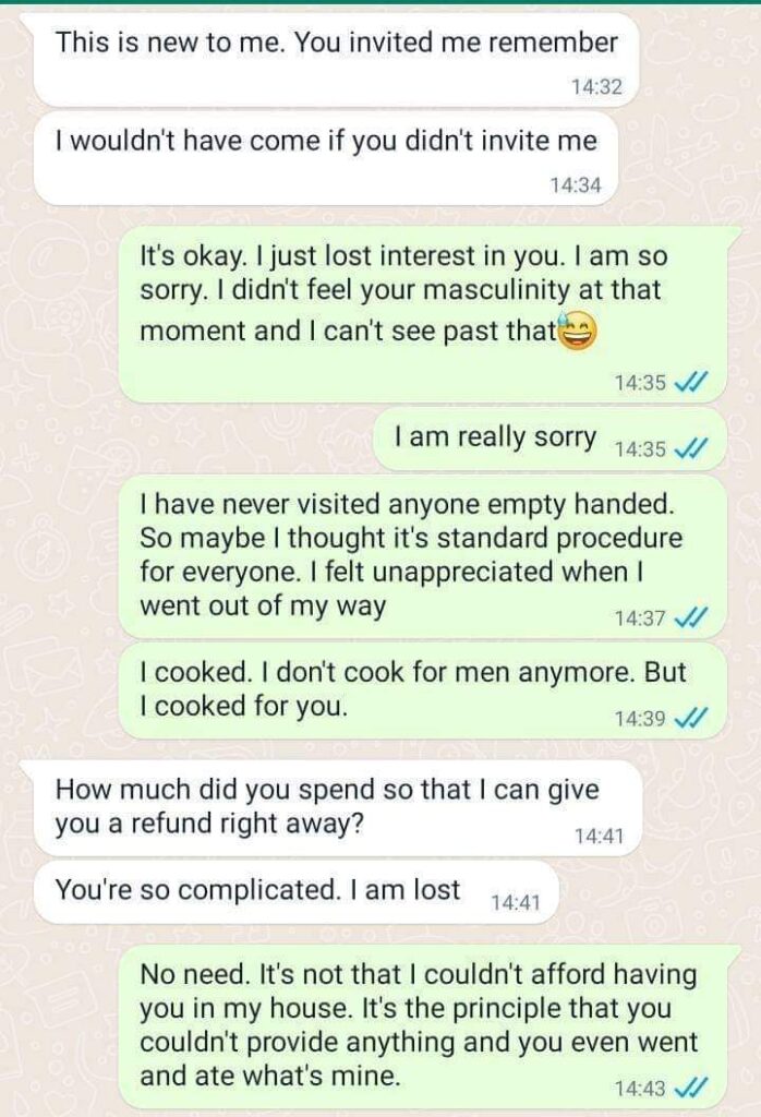 When he came, he just came empty-handed. Not even fruits in his hands. No shopping. At that point, I started losing interest but I still welcomed him. I served the food, we ate and drank.