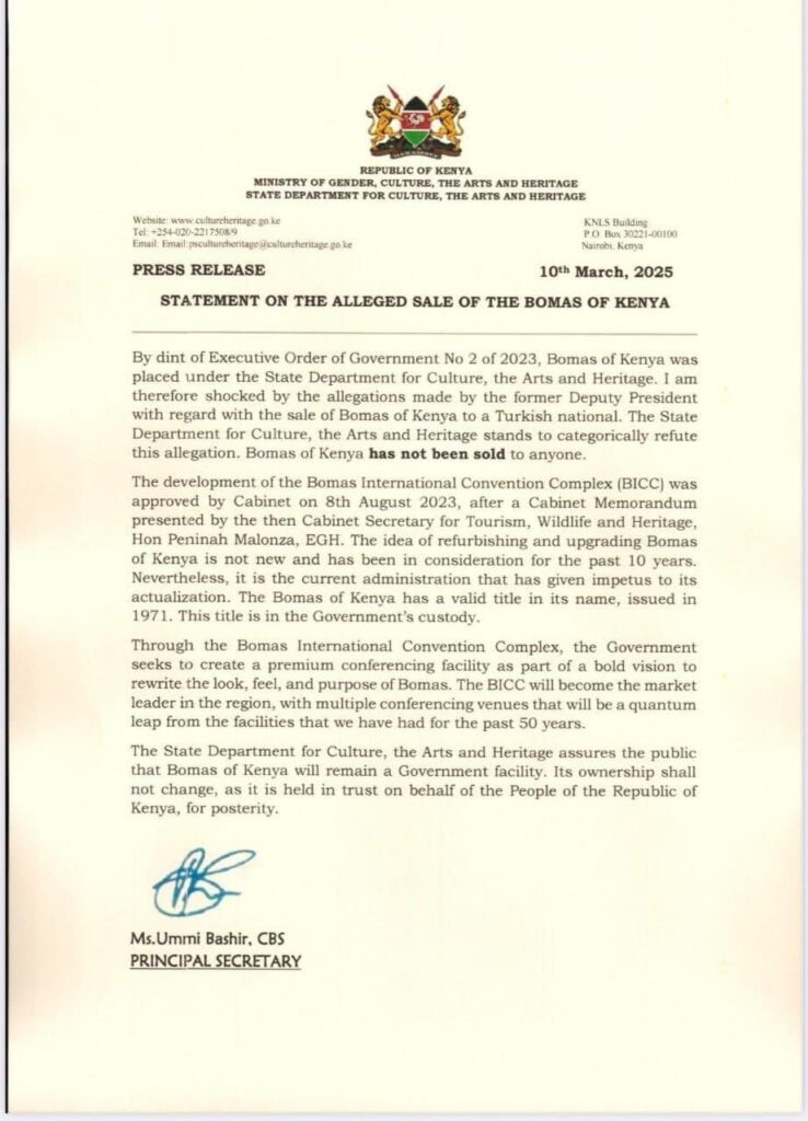 In a recent press release dated March 10, 2025, the Kenyan Ministry of Gender, Culture, the Arts, and Heritage has categorically denied allegations that the iconic Bomas of Kenya has been sold to a Turkish national. The statement, issued by Principal Secretary Ms. Ummi Bashir, CBS, refutes claims made by former Deputy President Gachagua, asserting that the cultural landmark remains a government facility held in trust for the people of Kenya.