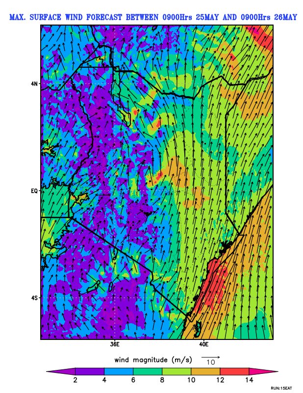 The maximum surface wind forecast map for the 24-hour period between 0900Hrs on May 25 and 0900Hrs on May 26 shows elevated wind magnitudes, particularly along the coastline and eastern counties. Coastal waters are also expected to remain choppy, with wave heights reaching up to 2.0 meters. This is likely to impact small boats, fishing activities, and beach operations.