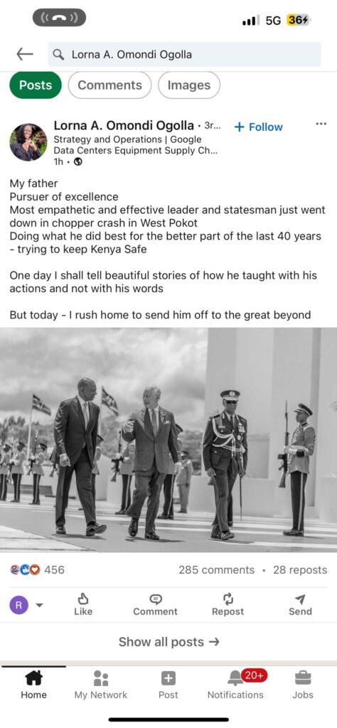In a poignant tribute on LinkedIn, Lorna described her father as a “pursuer of excellence” and lauded his unwavering commitment to serving Kenya. She highlighted his role as an empathetic and effective leader, emphasizing his dedication to keeping the nation safe over the span of four decades.