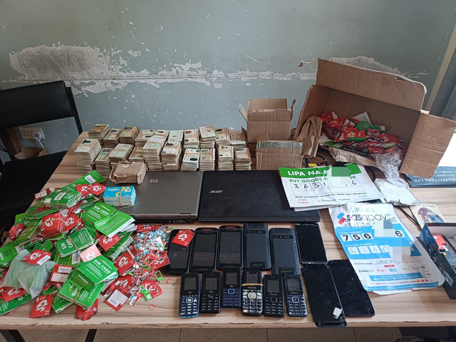 According to detectives, the suspects — 49-year-old Peter Mwendwa Musyoka and his 23-year-old son, Dennis Musyoka — were nabbed after a dramatic operation that followed weeks of digital tracking. The pair was arrested at their hideout in Komarock’s Nyama Villa estate, where police recovered a trove of evidence linked to their alleged fraudulent activities.