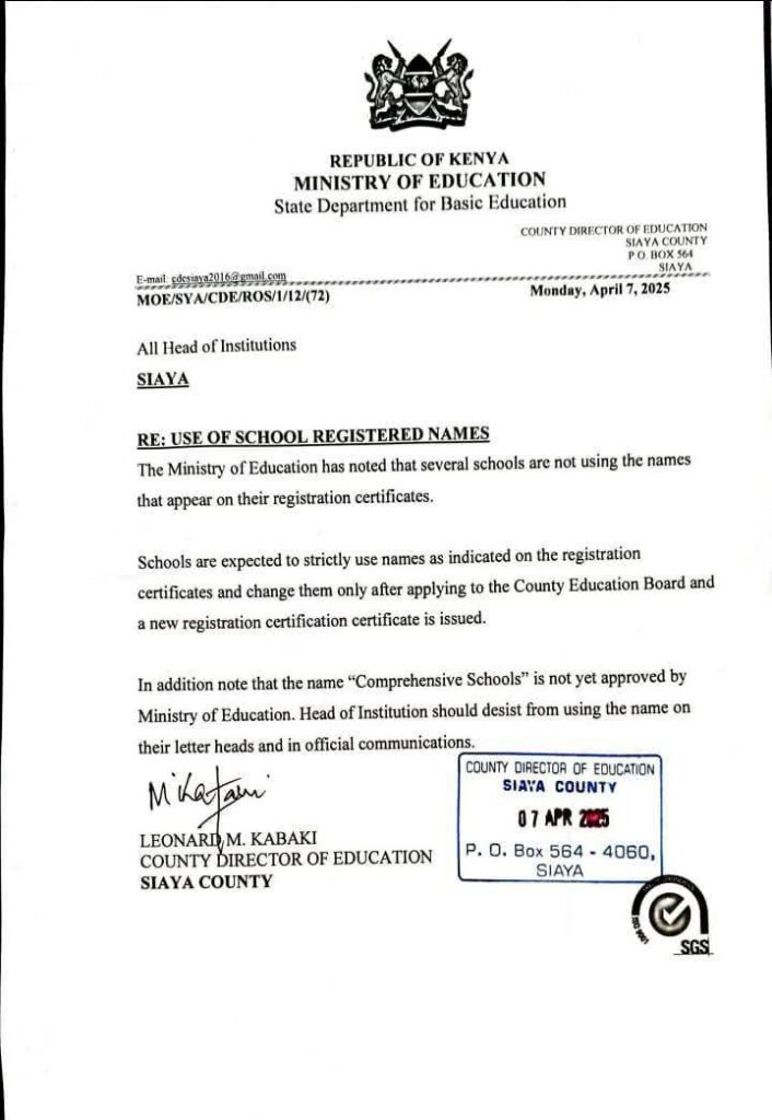 Siaya County, Kenya – The Ministry of Education has issued a stern warning to primary school heads against using unapproved names, particularly “Comprehensive Schools,” in official communications. In a circular dated April 7, 2025, Leonard M. Kabaki, the Siaya County Director of Education, emphasized that schools must strictly adhere to the names registered on their certificates or face repercussions.