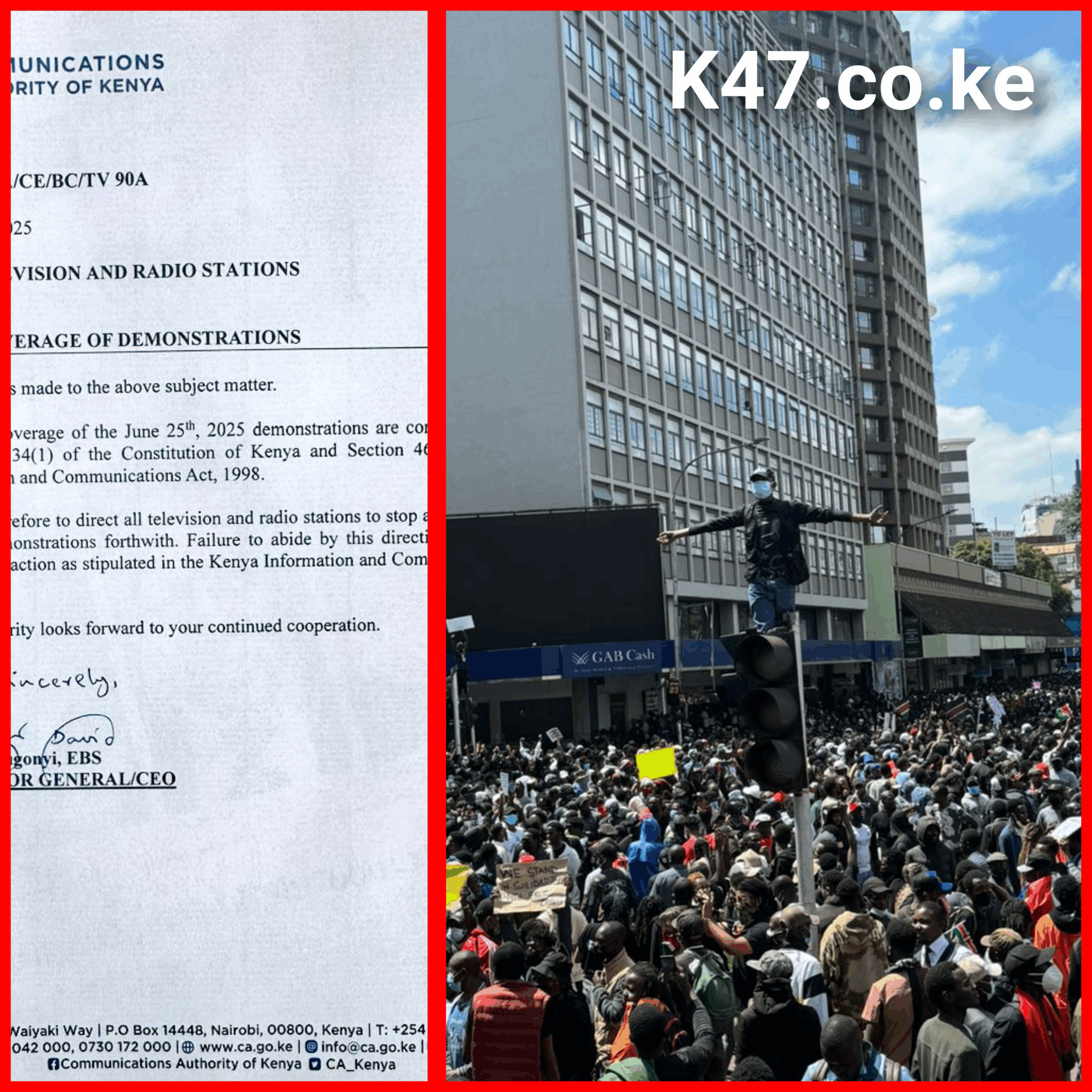The Nation Media Group (NMG), one of Africa’s largest media houses, confirmed in a strongly worded statement that the CA had “unconstitutionally” shut down NTV’s signal without due process. The move followed a social media advisory from the regulator ordering all TV and radio stations to stop live coverage of the protests, which have seen thousands take to the streets over economic grievances and alleged government overreach.