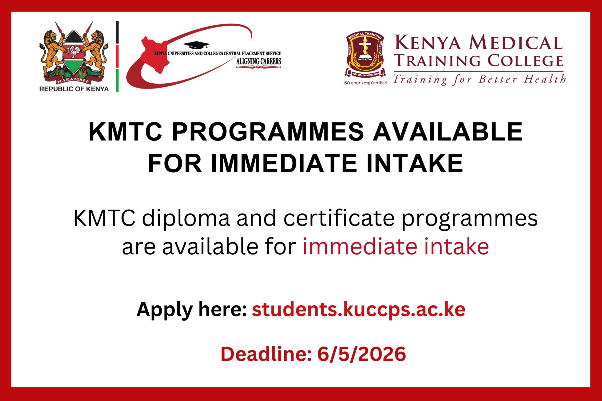 Students across Kenya have a fresh opportunity to pursue careers in the health sector as the Kenya Universities and Colleges Central Placement Service (KUCCPS), in collaboration with the Kenya Medical Training College (KMTC), announces an immediate intake for diploma and certificate programmes.