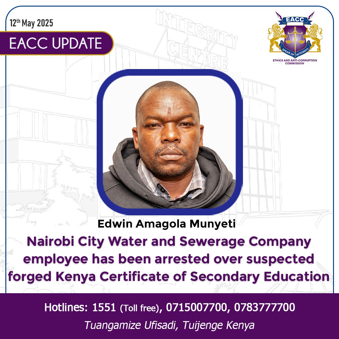 Munyeti’s case is the latest in a growing list of high-profile arrests by EACC targeting individuals who have used fake academic documents to gain employment in the public sector. The Commission has been cracking down on fraudulent recruitment practices, particularly where forged documents are used to obtain public jobs and financial benefits.