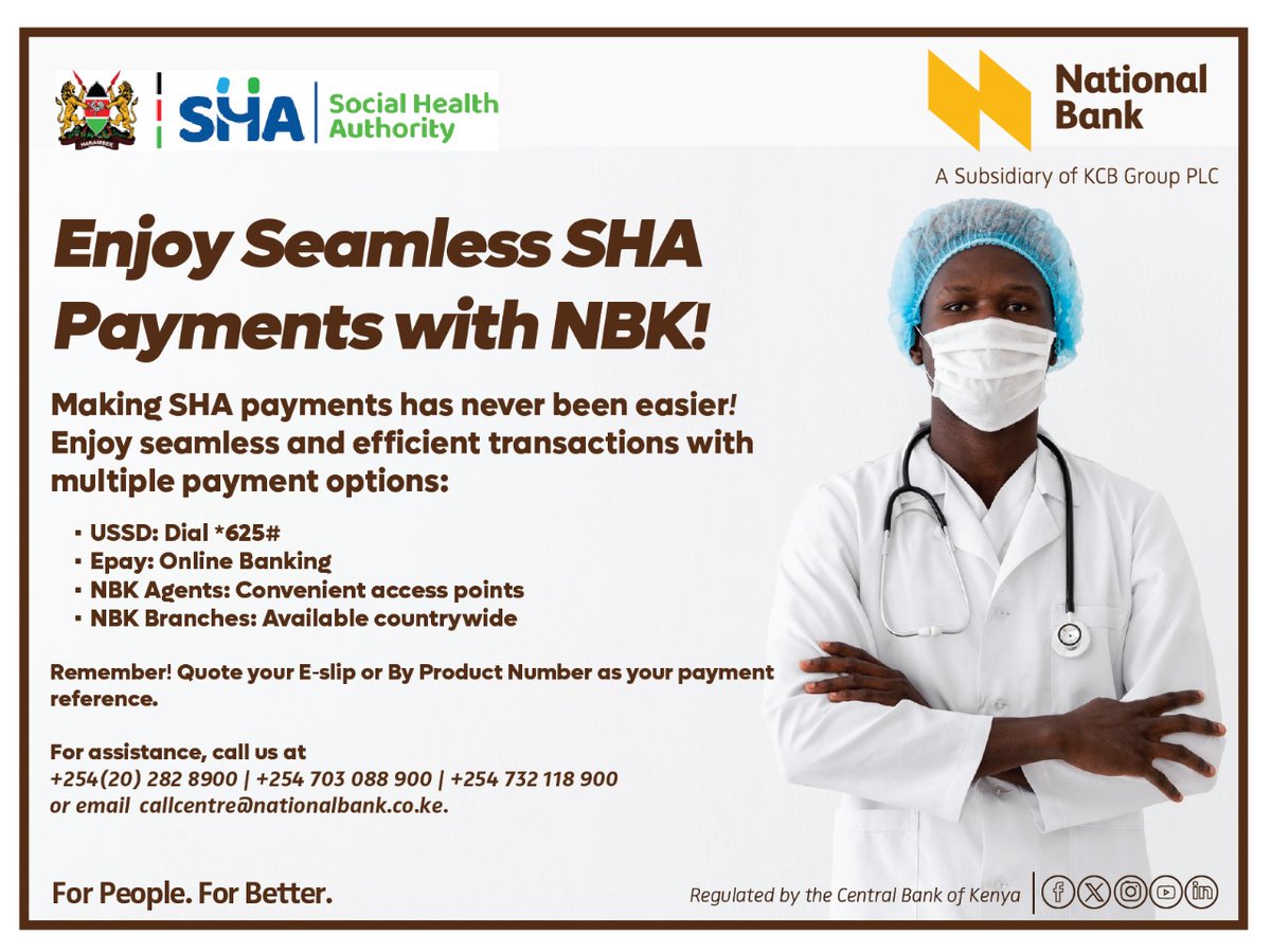 The National Bank of Kenya (NBK), a subsidiary of KCB Group PLC, has revolutionized how customers make Social Health Authority (SHA) payments. With multiple seamless and efficient payment options, NBK ensures a hassle-free experience for all users. Whether you prefer USSD, online banking, agents, or branch visits, NBK has you covered!