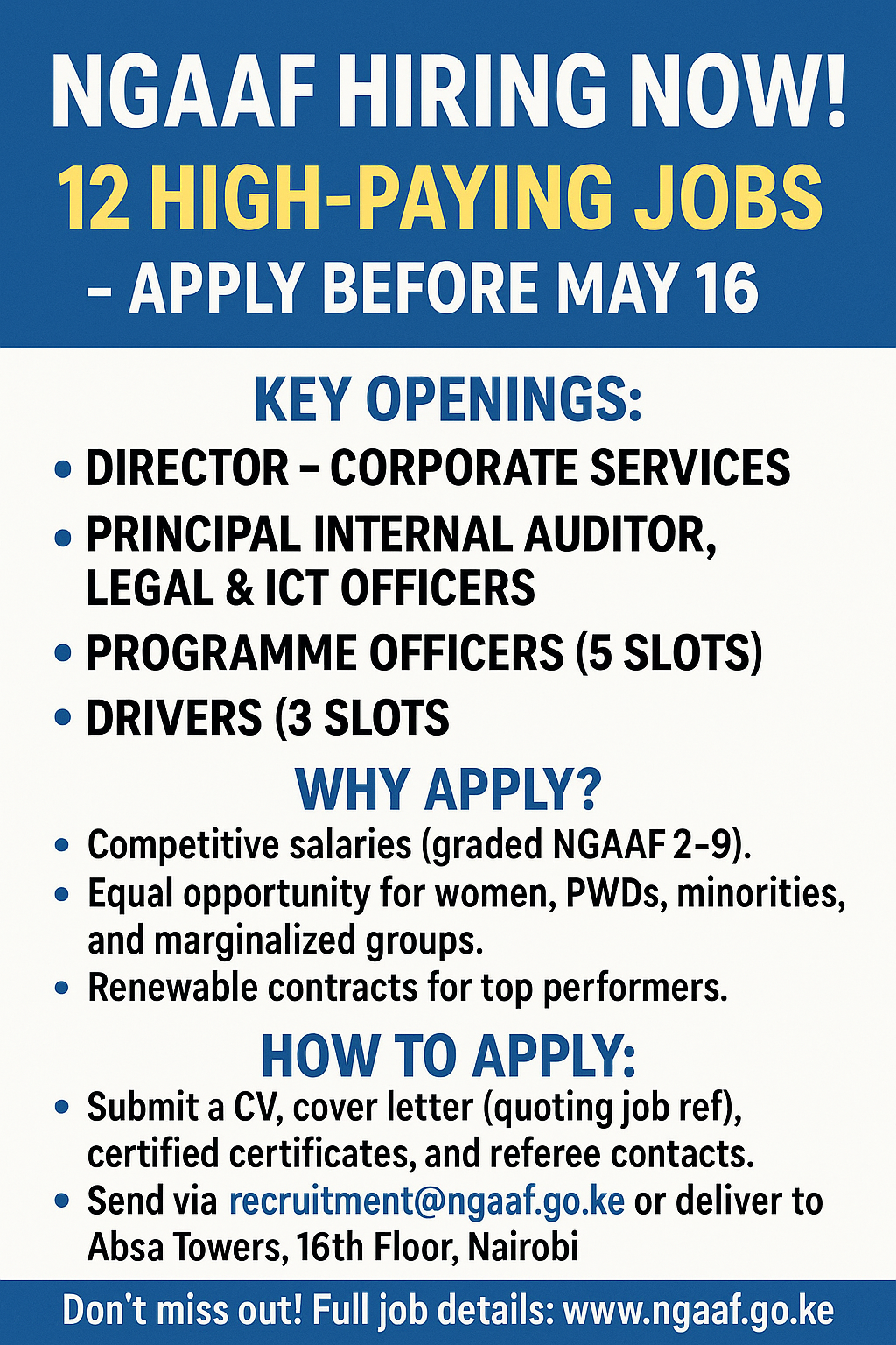 The National Government Affirmative Action Fund (NGAAF) has launched a massive recruitment drive, offering 12 high-profile jobs across multiple disciplines. From Director...
