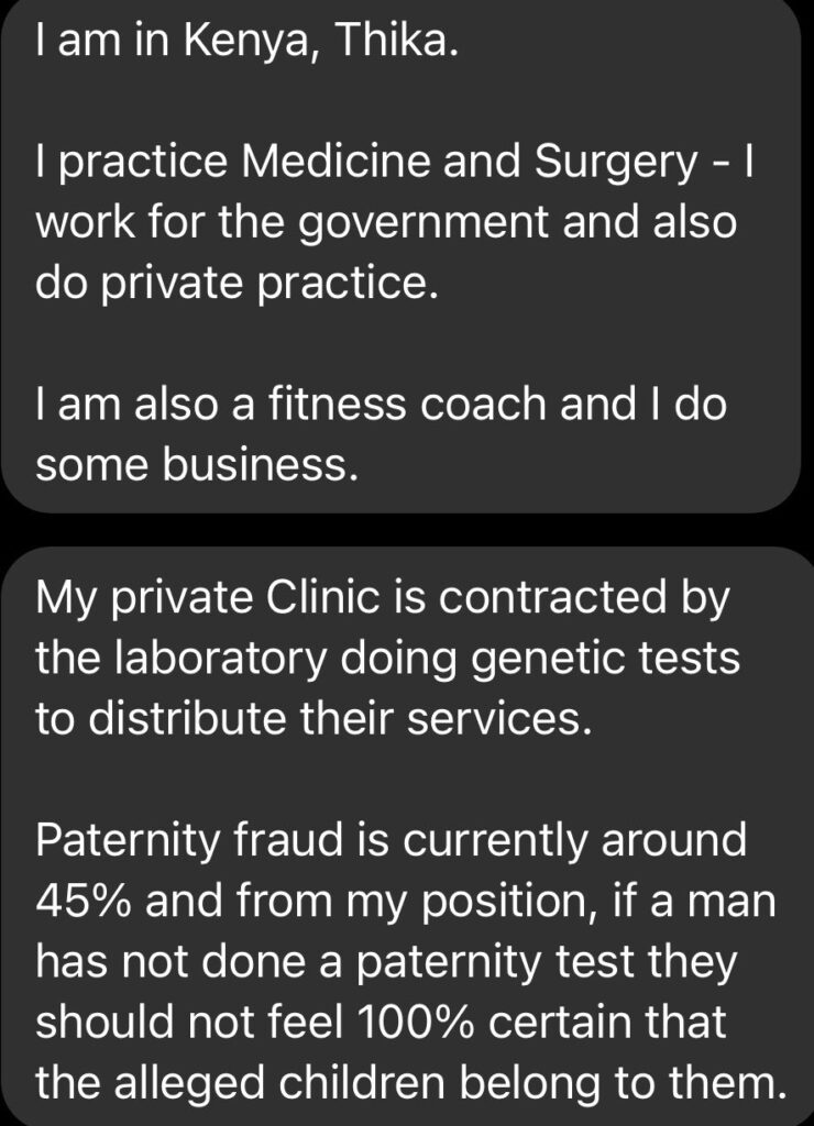 In a screenshot shared by former radio presenter Andrew Kibe, a man, who is a doctor in Thika has confessed on the claim.