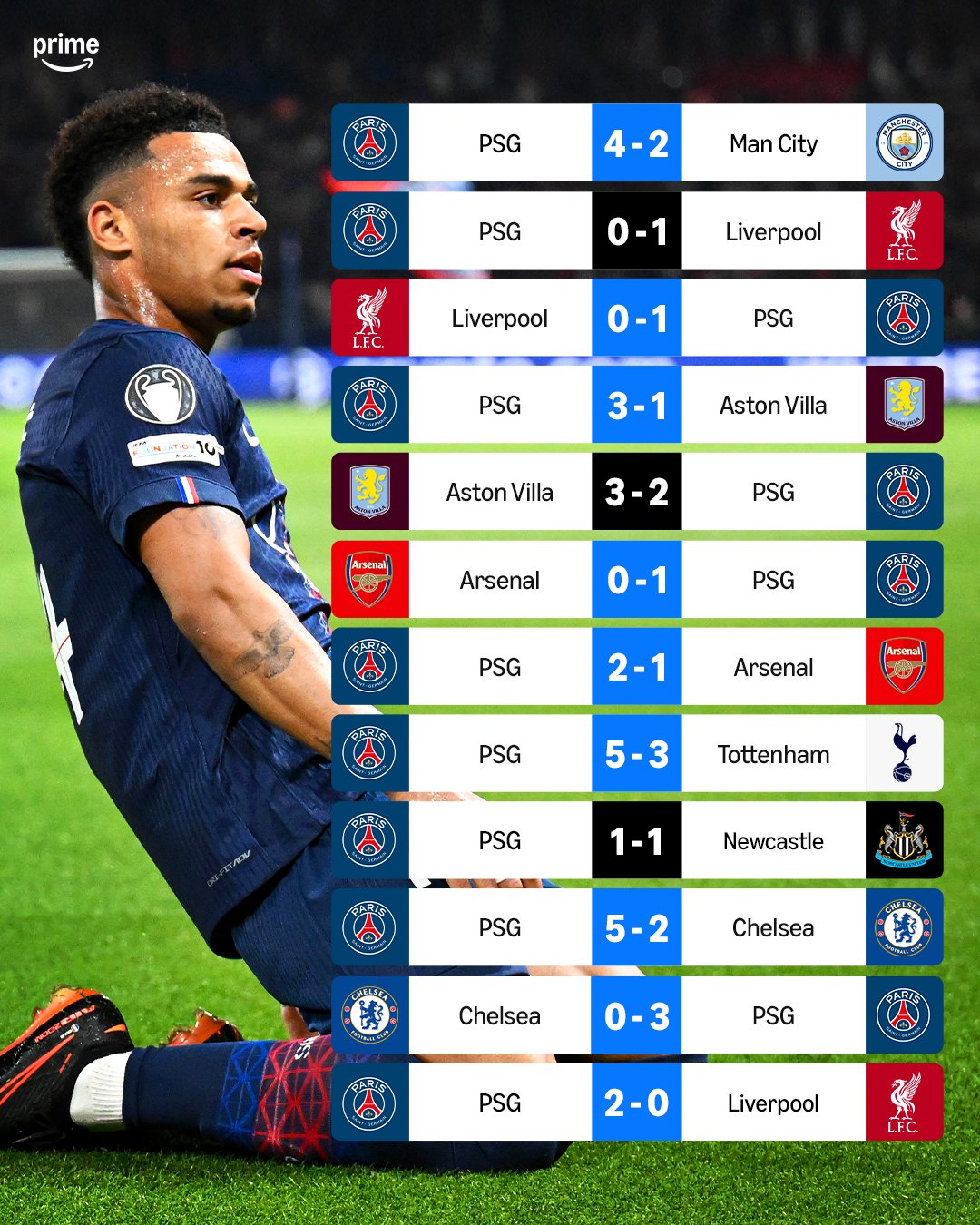 Their results paint a clear picture: PSG are not just competing—they are dominating. Big wins like 4-2 against Manchester City and 5-2 versus Chelsea highlight their attacking depth, while disciplined victories such as 1-0 away at Arsenal show they can grind out results when needed.