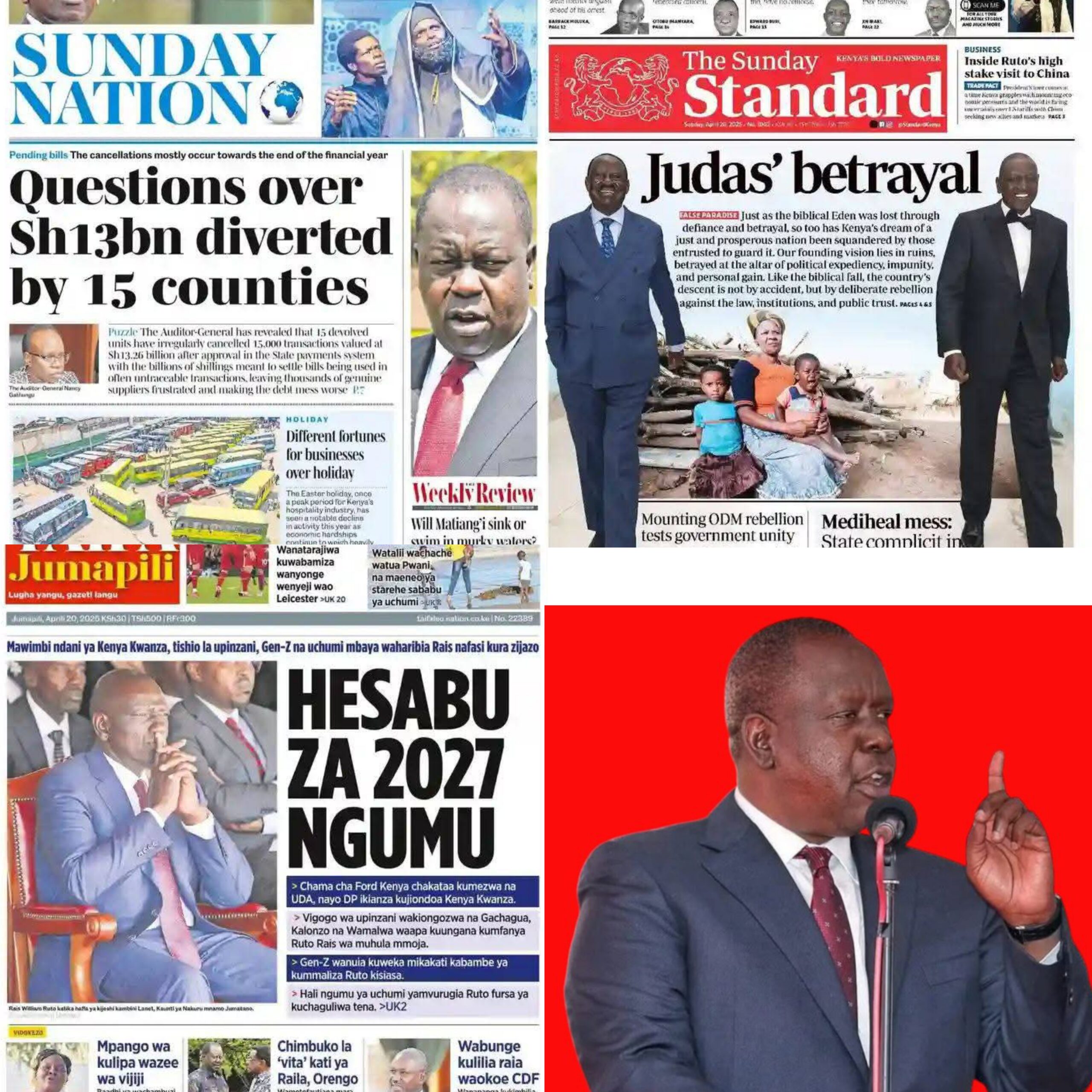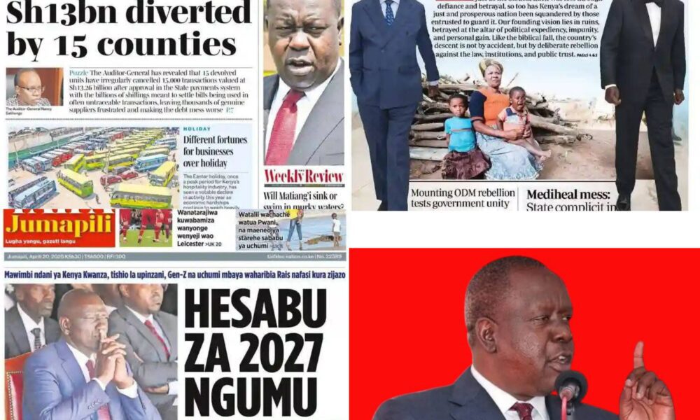 Kenya woke up to a flurry of explosive newspaper headlines today, Saturday, April 20, 2025, as the nation’s dailies offered a snapshot of deepening political wrangles, looming economic turbulence, and growing public discontent.