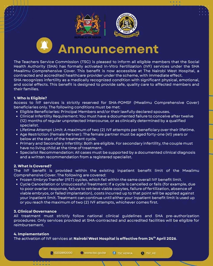 The announcement, made in collaboration with the Social Health Authority (SHA), confirms that eligible beneficiaries can now access IVF services at Nairobi West Hospital. The program officially took effect on April 24, 2026, signaling the beginning of a new era in inclusive healthcare for educators across the country.